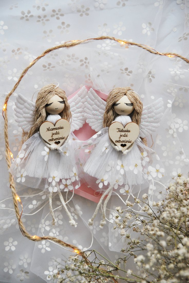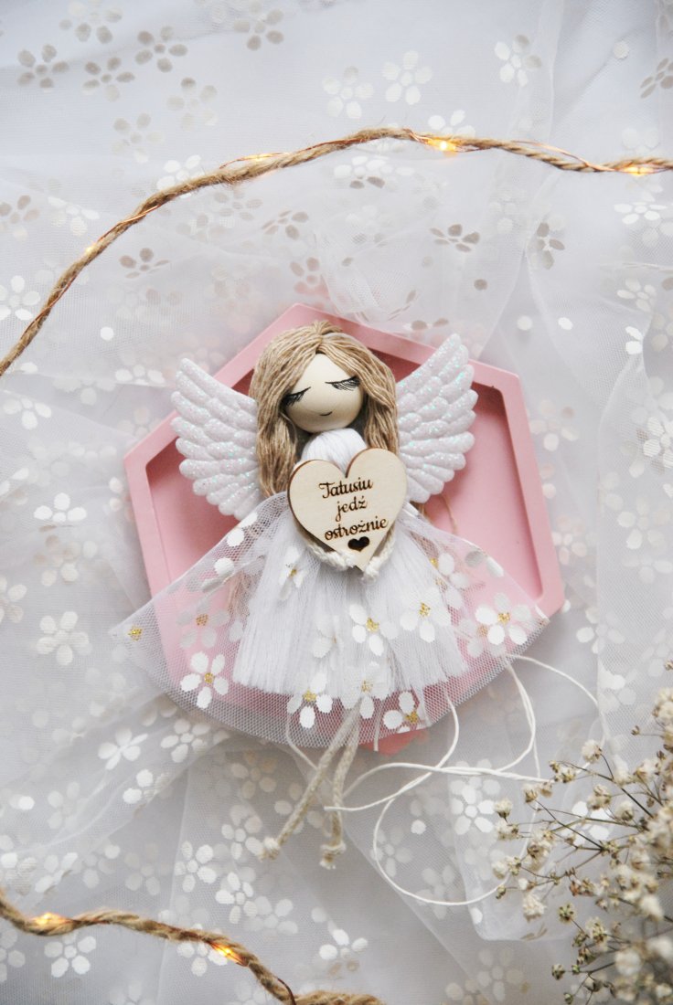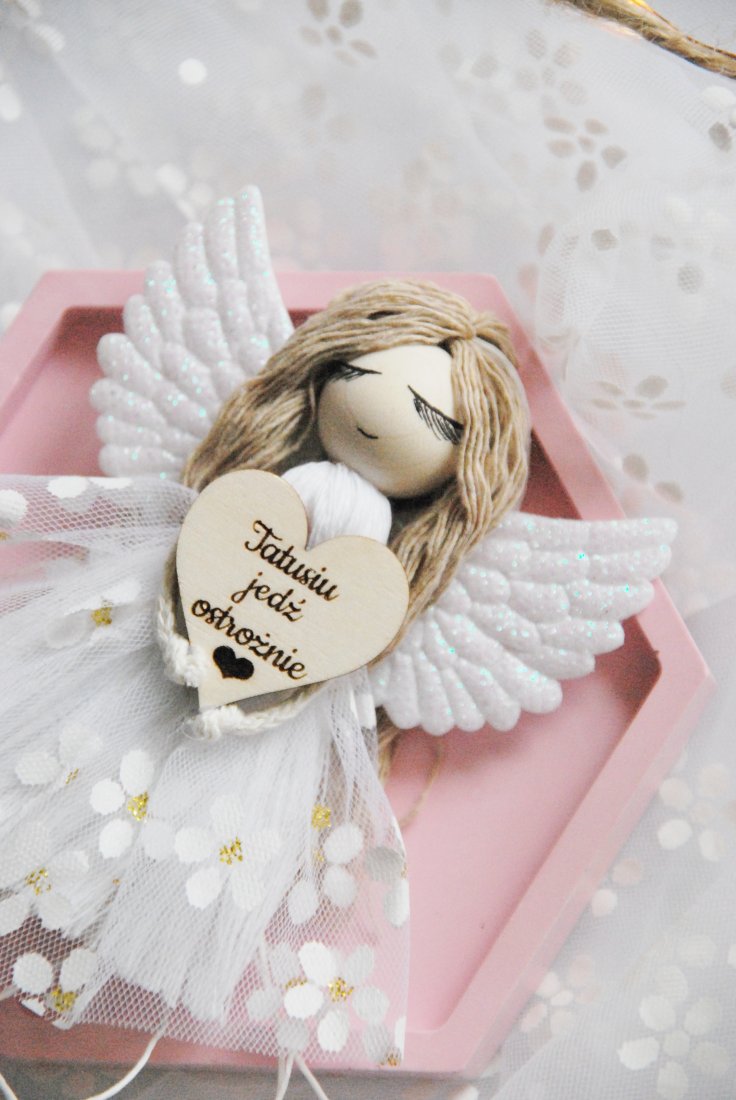 Ręcznie wykonany, pełen subtelnych detali aniołek z miękkimi skrzydłami i jasną, delikatną sukienką trzyma w dłoniach drewniane serduszko z wygrawerowanym przesłaniem: "Tatusiu jedź ostrożnie". To coś więcej niż zawieszka do samochodu – to symbol troski, szacunku i miłości, która towarzyszy Tacie na każdej drodze.