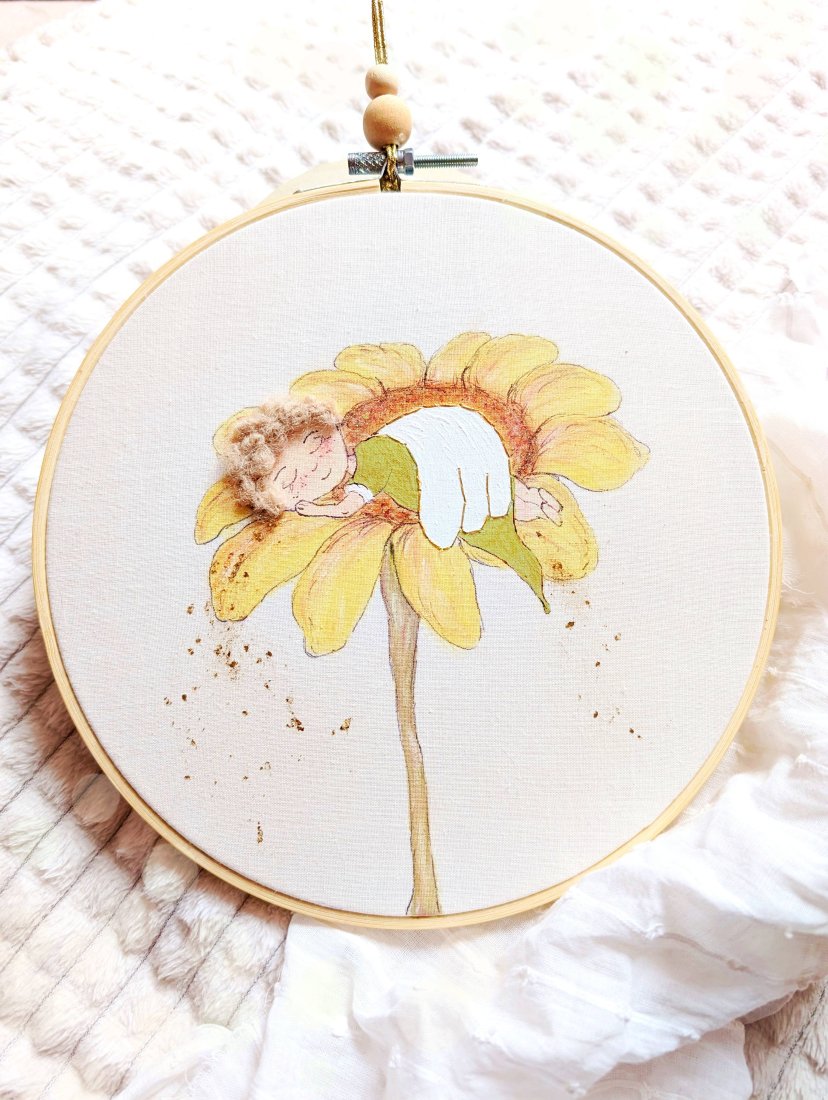 Oprawiony jest w bambusowy tamborek o średnicy 20 cm.
