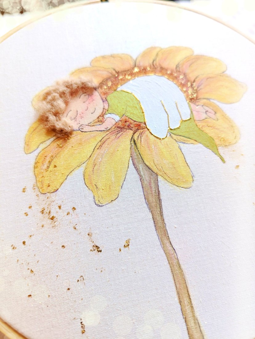 Efekt 3D tworzą włoski aniołka i błyszczące koraliki.