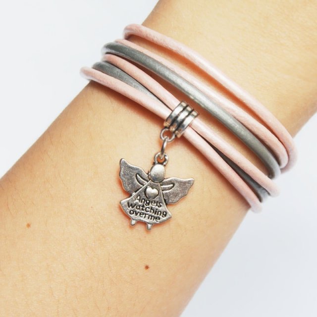 POMYSŁ NA PREZENT ;-) delikatna bransoletka wykonana z 3 rzemieni ze 100% skórki naturalnej w odcieniach metalicznych/perłowych (TUTAJ: uroczy odcień cielisto-różowy + szary/srebrny). zawieszka i wykończenie w kolorze srebra (dwustronny aniołek z napisem ANGELS WATCHING OVER ME). długość regulowana za pomocą łańcuszka. BRANSOLETKA PASUJE NA NADGARSTEK OD 15,5CM. możesz ją nosić samodzielnie lub dowolnie łączyć z innymi bransoletkami z tej serii. świetnie prezentuje się też w zestawieniu z bransoletkami z kamieni naturalnych. ZOBACZ CAŁĄ KOLEKCJĘ!!! ... MOJA BIŻU ZAWSZE PODRÓŻUJE OZDOBNIE ZAPAKOWANA ;-) ...
