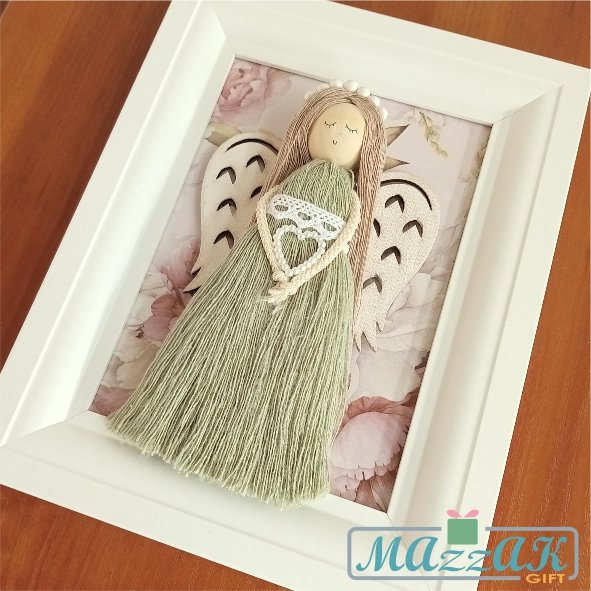 ANIOŁEK W BIAŁEJ RAMCE HANDMADE PREZENT PAMIĄTKA CHRZEST KOMUNIA NARODZINY ŚWIĘTA ZIELONY