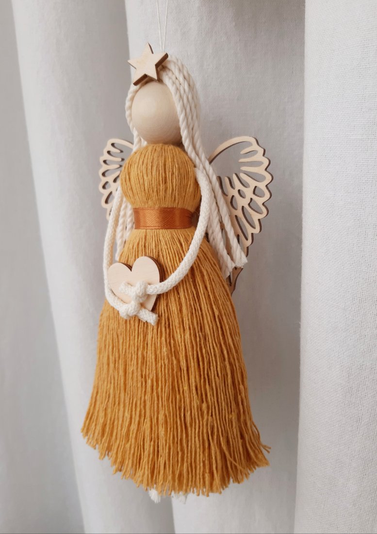 Aniołek o wysokości 22cm /plus zawieszka/ wykonany ręcznie, ozdobiony drewnianymi skrzydełkami i sznurkową sukienką w kolorze miodowym.
