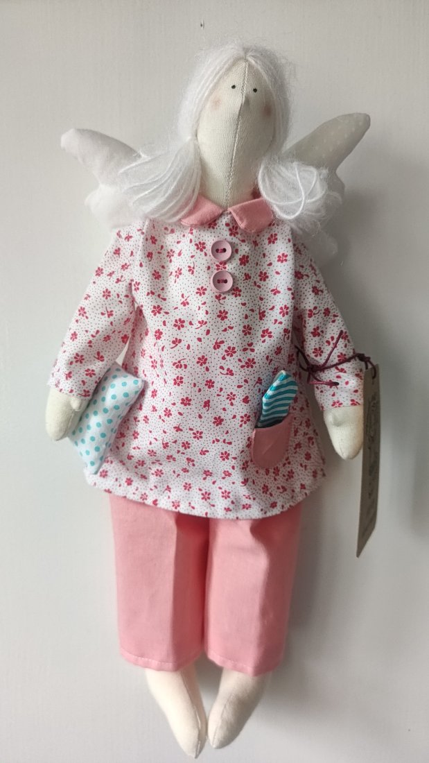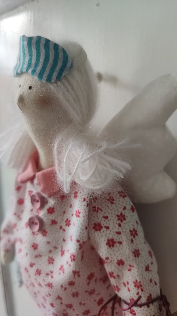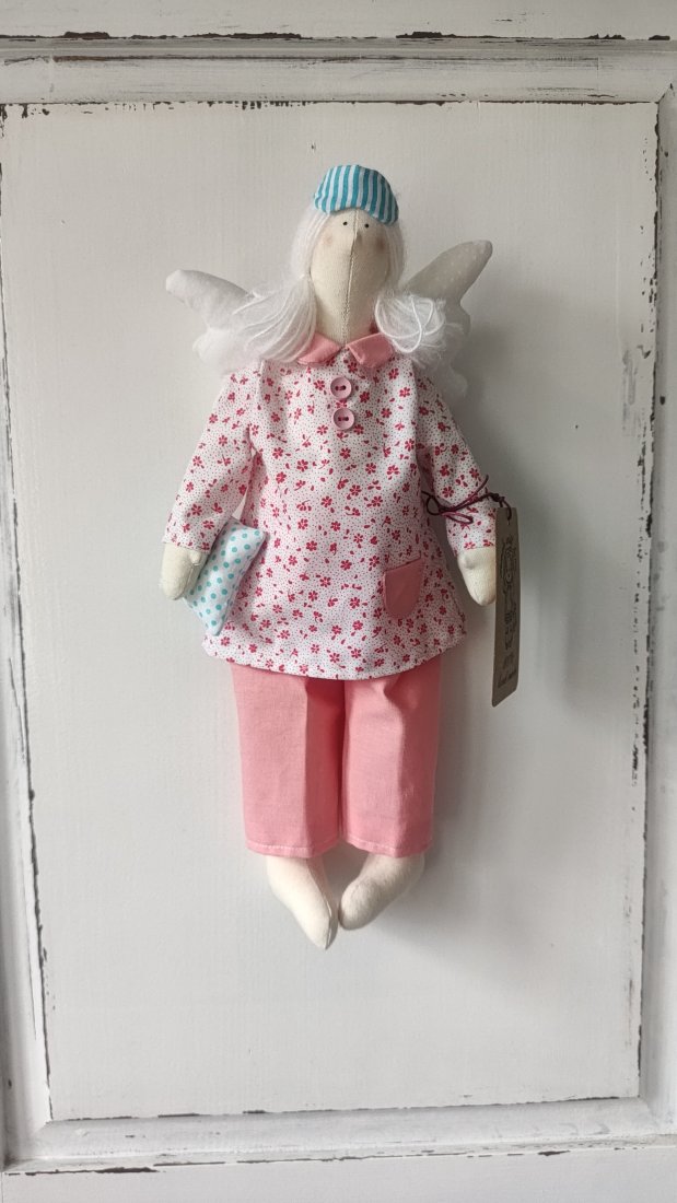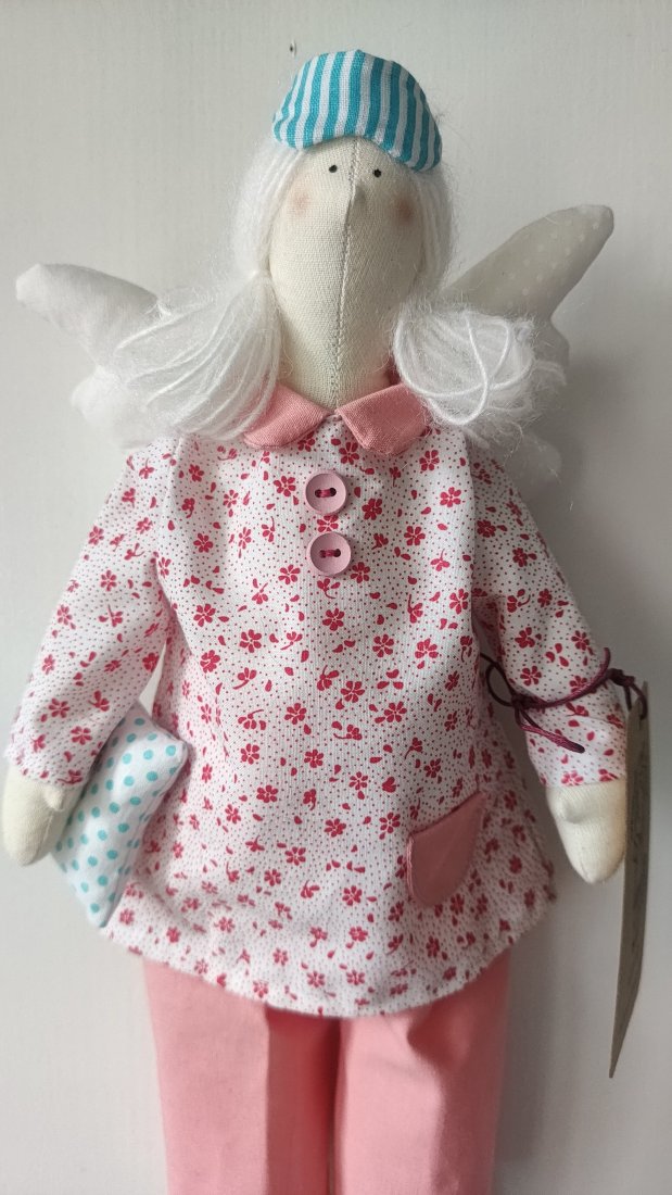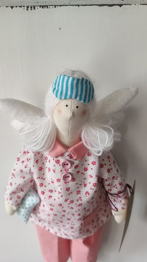 Aniołek tilda w piżamce. Stróż pięknych i kolorowych snów :) Uszyty starannie z detalami. Może siedzieć i wisieć. Ozdobi każdy kącik. Dobry pomysł na prezent.