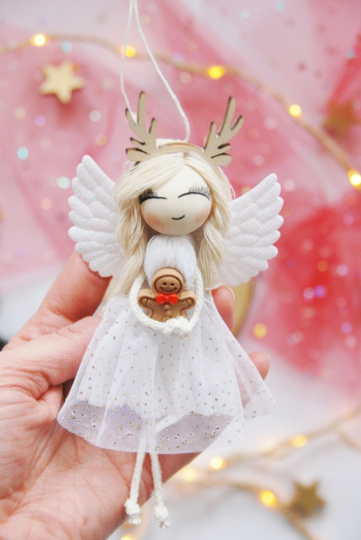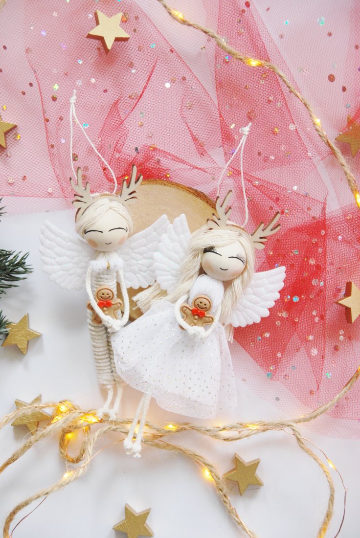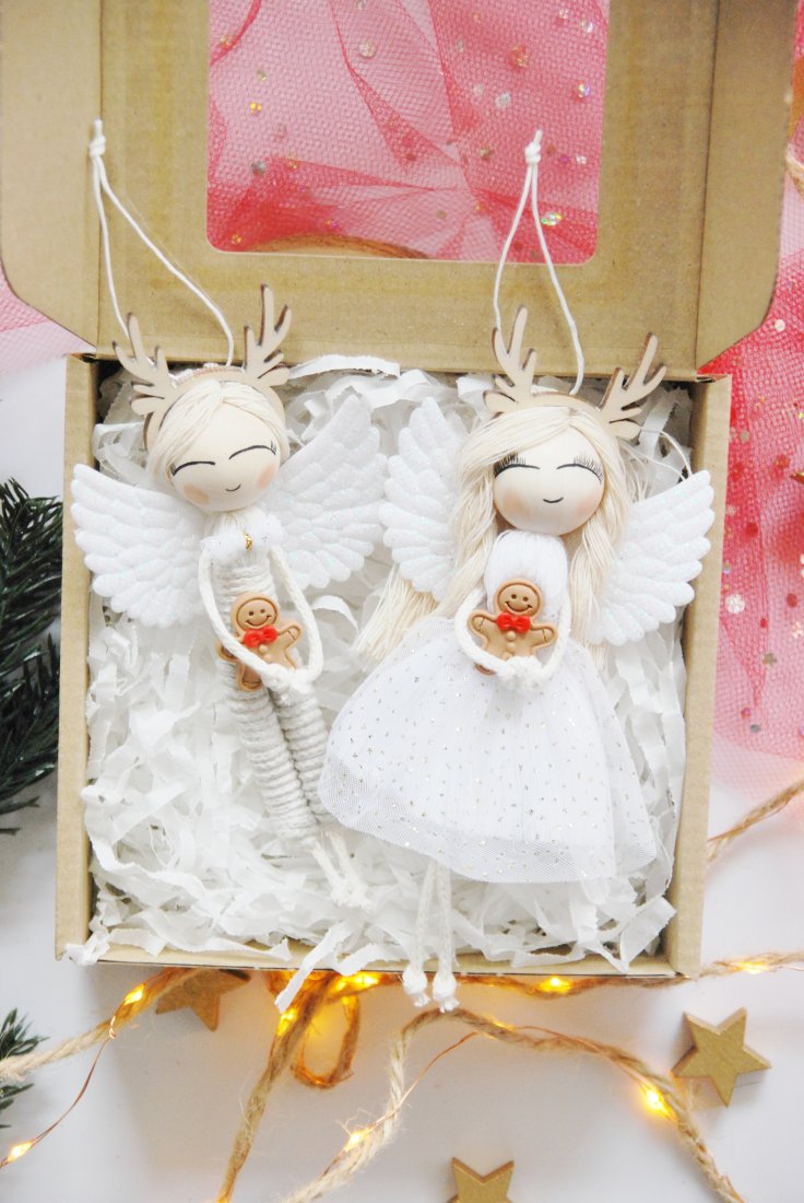 Uroczy zestaw dwóch ręcznie wykonanych aniołków świątecznych. Każdy z nich został wykonany z niezwykłą starannością i dbałością o każdy detal – od delikatnych skrzydeł, po maleńkie rączki trzymające piernikowego ludzika, który symbolizuje radość, domowe ciepło i wspólne świętowanie.