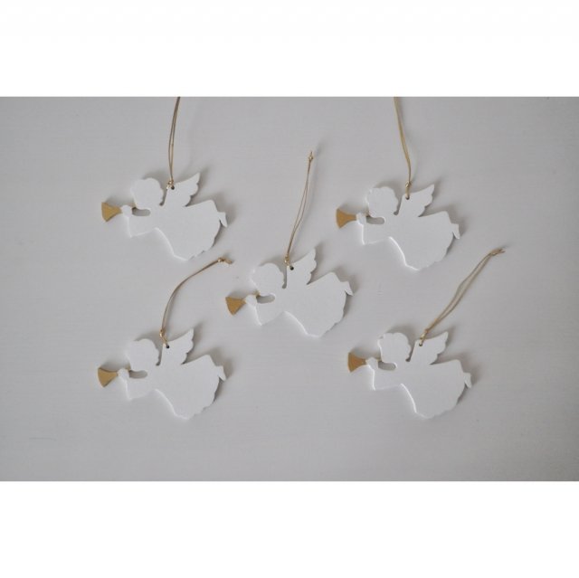 Komplet pięciu zawieszek w kształcie aniołków. Aniołki zostały wycięte z drewnianej sklejki i pomalowane na biało. Zawieszone są na złotym sznureczku. Wym. ok. 7 cm.