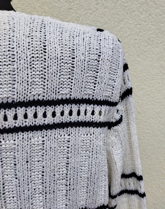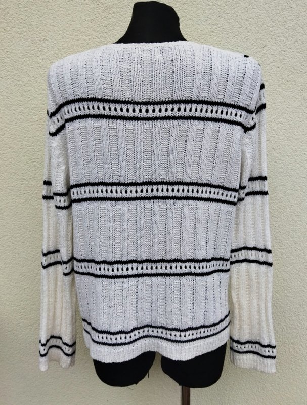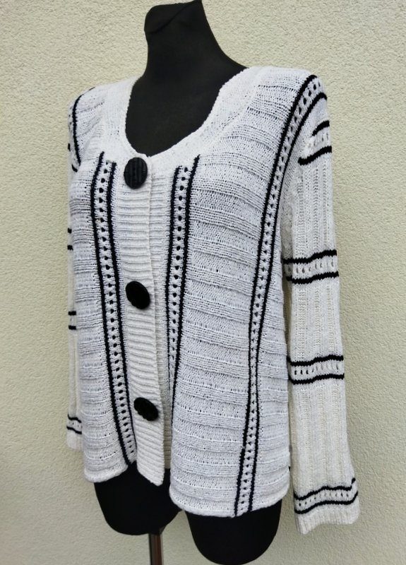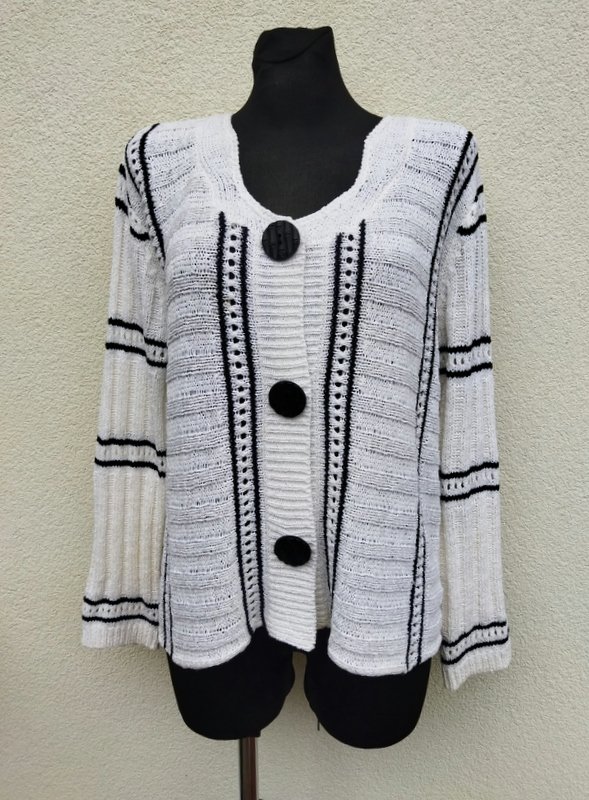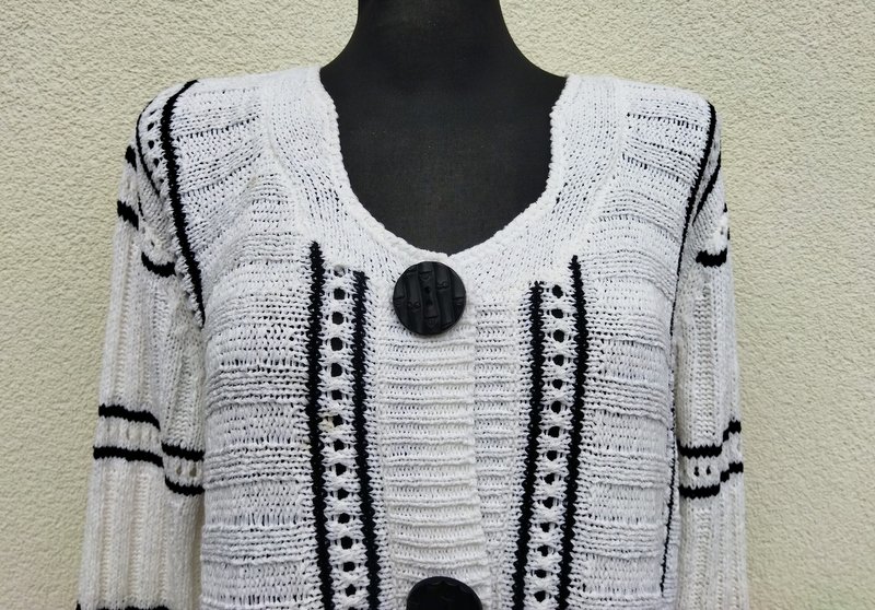 Elegancki sweter z akrylowej włóczki z nylonem w kolorze mlecznej bieli z częściowo ażurowym wzorem i czarnymi paseczkami. Bez kołnierza , zapinany od wewnątrz na zatrzaski, naszywane guziki w czarnym kolorze pełnia rolę ozdobną.