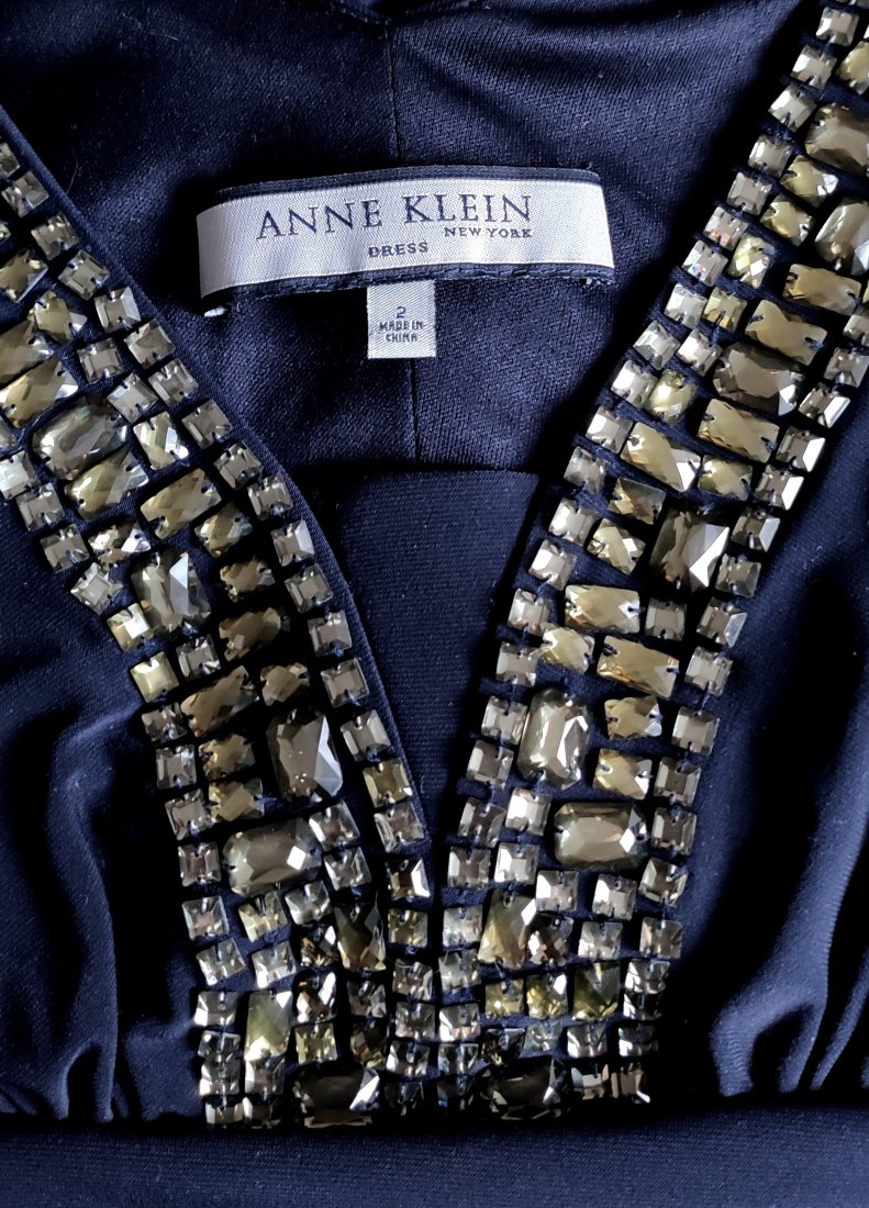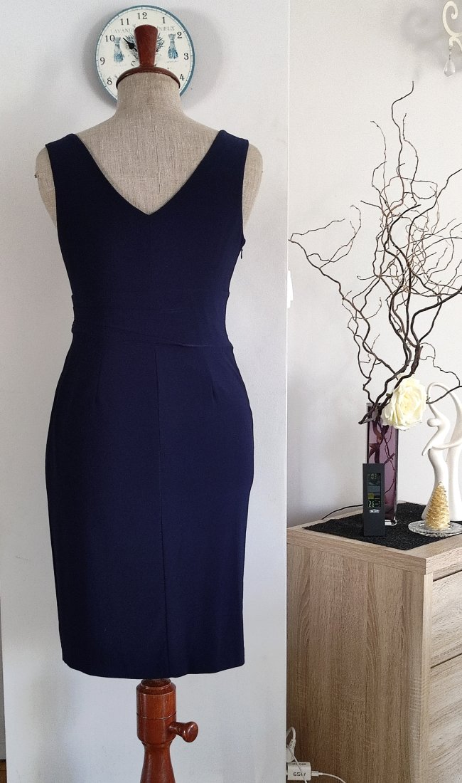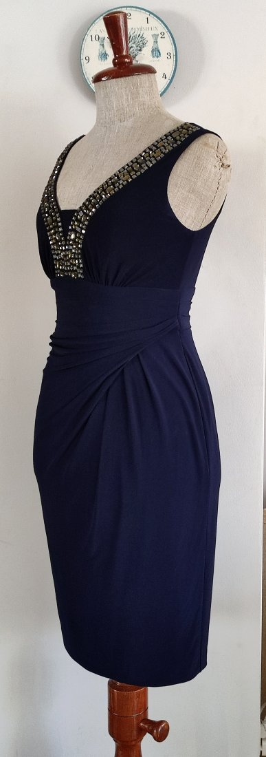 Elegancka sukienka wieczorowa w kolorze granatowym, bogato zdobiona przy dekolcie. Materiał jest rozciągliwy i łanie układa się do sylwetki a efektowne marszczenia poniżej pasa,korygują ewentualne niedoskonałości sylwetki.