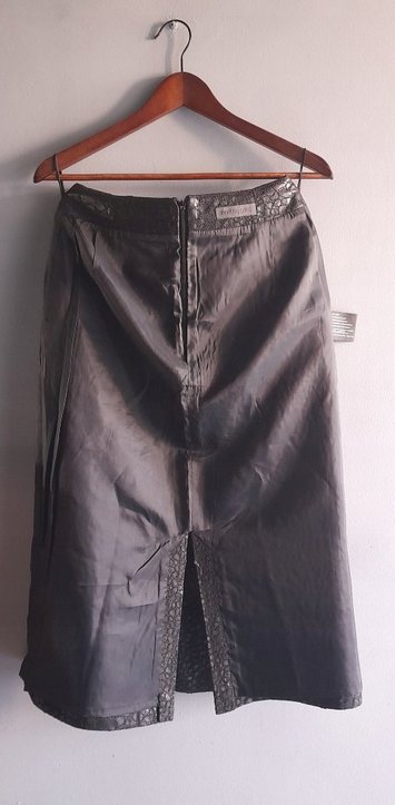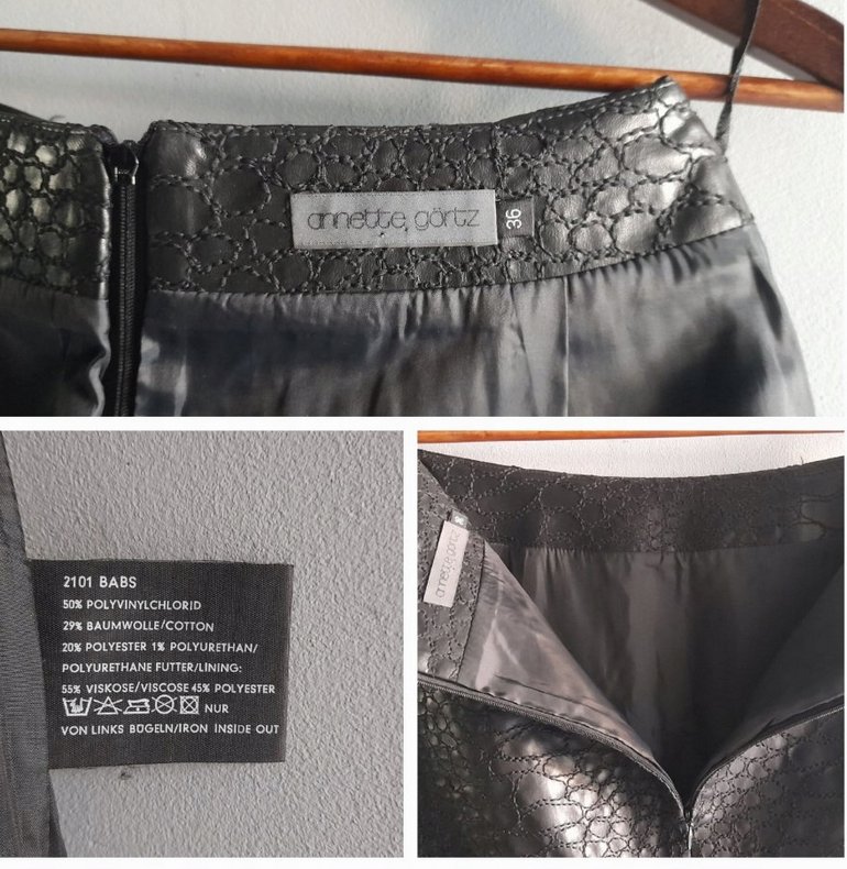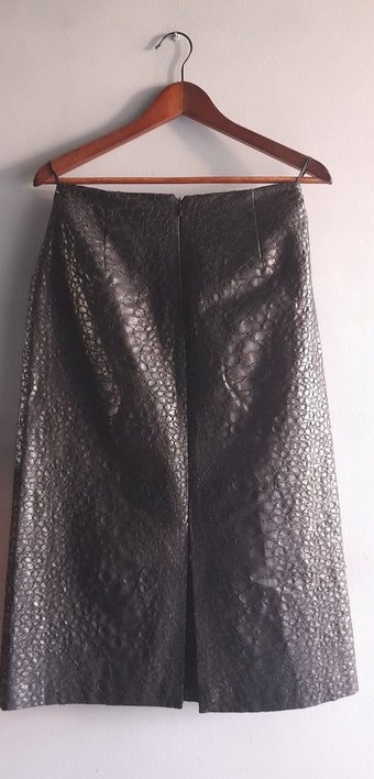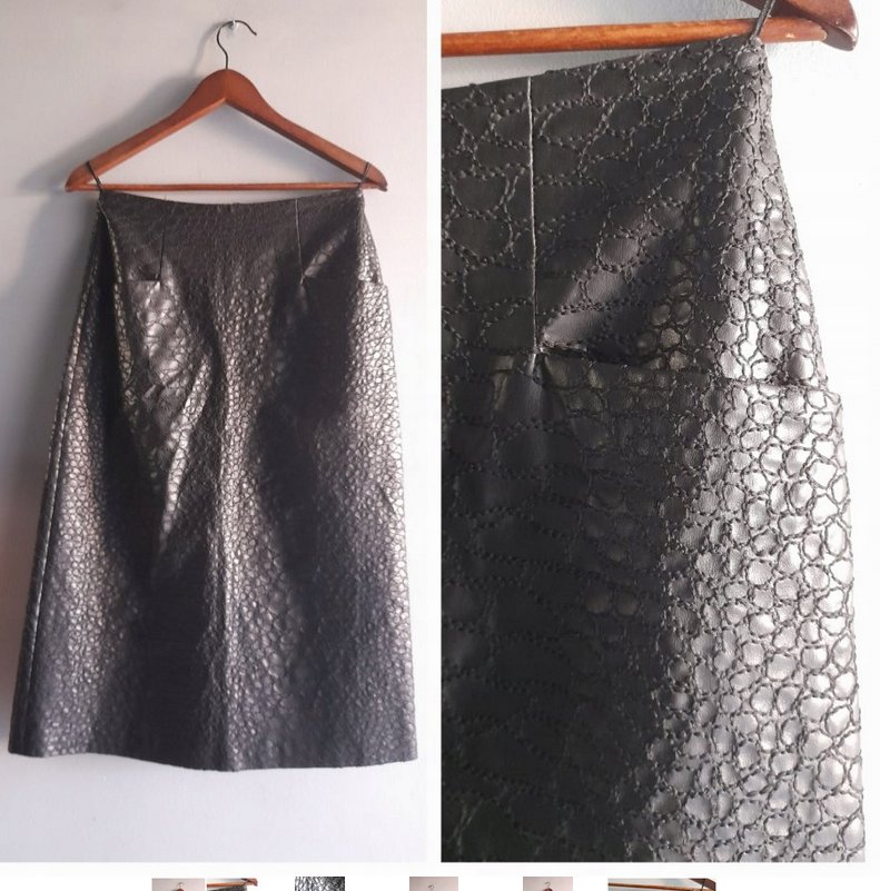 Designerska spódnica z haftowanej eko skóry, z podszewką, z tyłu zapinana na zamek, z przodu kieszenie, świetnie się prezentuje na sylwetce, unikat, długość 75, pas 34x2, biodra ok50x2, w realu plus 100%