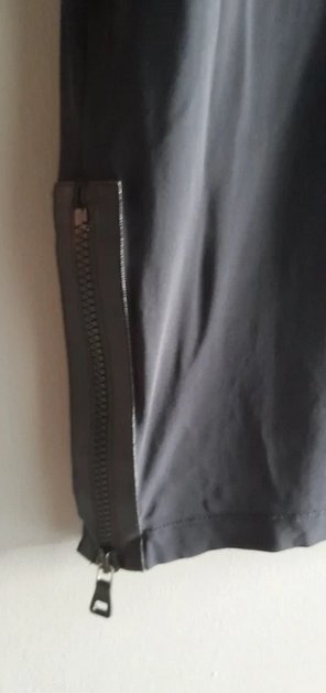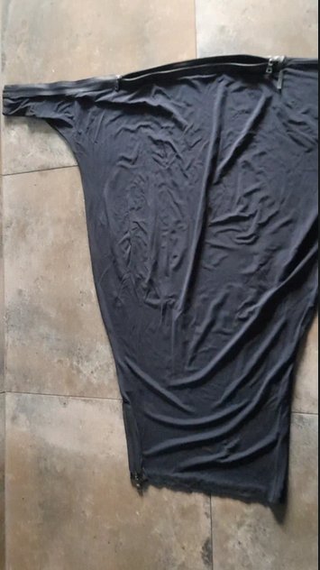 Sukienka z lejącej wiskozy, świetny ciekawy projekt maskujący ewentualne niedoskonałości figury, dekolt można kreatywnie regulować zamkiem, który przechodzi na cały jeden rękaw i jes świetnym elementem dekoracyjnym, również na dole z jednego boku, rozmiar z metki L, doskonale również na M,XL ,długość 100, szerokość na wysokości biustu ok.70x2, łagodnie do bioder zwęża się do 40 nq dole, stan bardzo dobry, granat