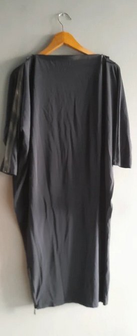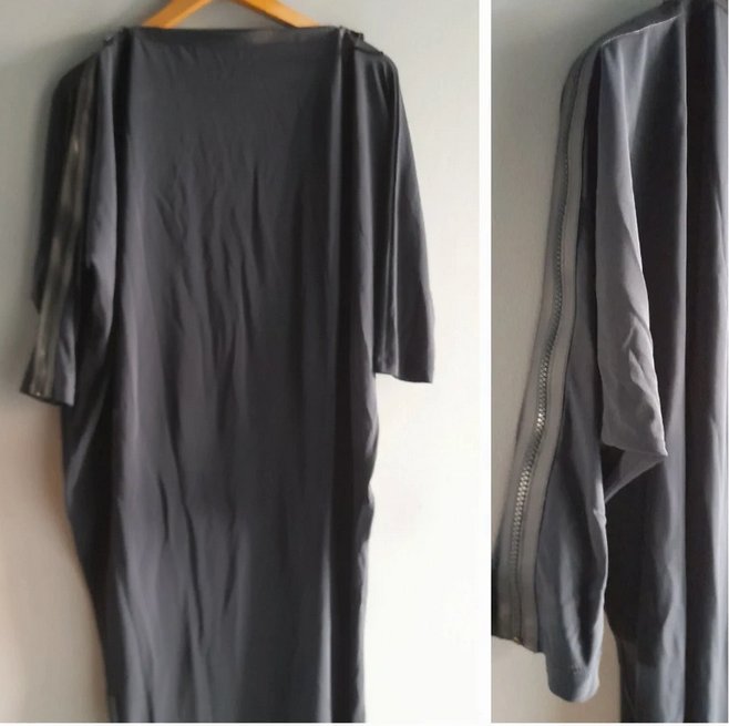 Sukienka z lejącej wiskozy, świetny ciekawy projekt maskujący ewentualne niedoskonałości figury, dekolt można kreatywnie regulować zamkiem, który przechodzi na cały jeden rękaw i jes świetnym elementem dekoracyjnym, również na dole z jednego boku, rozmiar z metki L, doskonale również na M,XL ,długość 100, szerokość na wysokości biustu ok.70x2, łagodnie do bioder zwęża się do 40 nq dole, stan bardzo dobry, granat