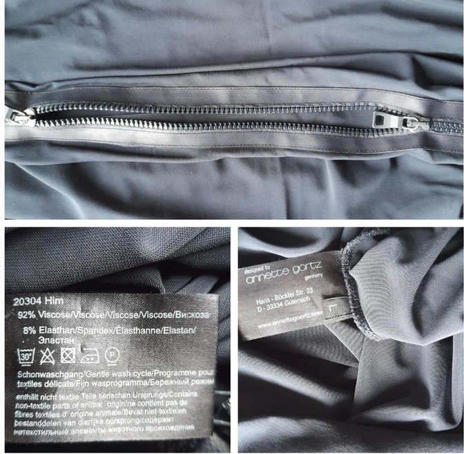 Sukienka z lejącej wiskozy, świetny ciekawy projekt maskujący ewentualne niedoskonałości figury, dekolt można kreatywnie regulować zamkiem, który przechodzi na cały jeden rękaw i jes świetnym elementem dekoracyjnym, również na dole z jednego boku, rozmiar z metki L, doskonale również na M,XL ,długość 100, szerokość na wysokości biustu ok.70x2, łagodnie do bioder zwęża się do 40 nq dole, stan bardzo dobry, granat