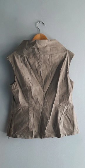 Raz założona stan idealny gorsetowa bluzka bez rękawów 70 len 30 elastan,lekko rozciągliwa, dopasowuje się do sylwetki, kolor khaki z lekkim połyskiem, długość 55 szerokość pod pachami ok 50 bez naciągania, przepraszam że wymięta