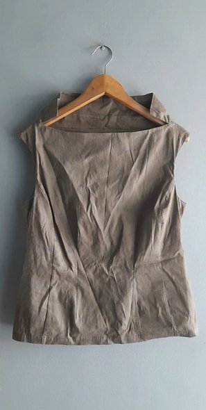 Raz założona stan idealny gorsetowa bluzka bez rękawów 70 len 30 elastan,lekko rozciągliwa, dopasowuje się do sylwetki, kolor khaki z lekkim połyskiem, długość 55 szerokość pod pachami ok 50 bez naciągania, przepraszam że wymięta