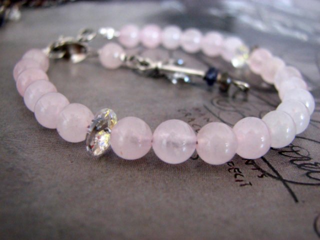 Różano - pudrowa bransoletka wykonana z polerowanych jadeitów (6mm kuleczki), fasetkowanych kropelek iolitu - zwanego szmaragdem wodnym, połyskliwych kryształów swarovski w kolorze crystal AB oraz oksydowanego/polerowanego srebra.
