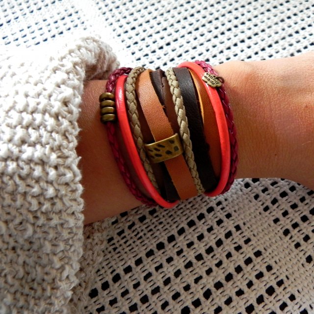 Efektowna bransoletka w stylu boho, utrzymana w jesiennej kolorystyce, wykonana tylko w JEDNYM EGZEMPLARZU, z różnorodnych plecionych rzemieni ze skóry ekologicznej i naturalnej oraz elementów w kolorze antycznego brązu. Bransoletka będzie pasowała na nadgarstek 15-17 cm, podwójnie oplatana.