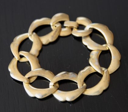 Naszyjnik vintage w antycznym stylu zrobiony z pojedynczych kół, dzięki czemu ładnie dopasowuj się do kształtu nadgarstka. Z tyłu mało widoczne zapięcie (w pełni sprawne). Kolor złoty, częściowo odbarwiony (patrz zdjęcie).