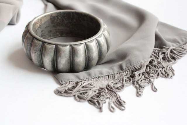 Oryginalna bransoleta o masywnym wyglądzie w kolorze starego srebra. Wykonana z metalu.