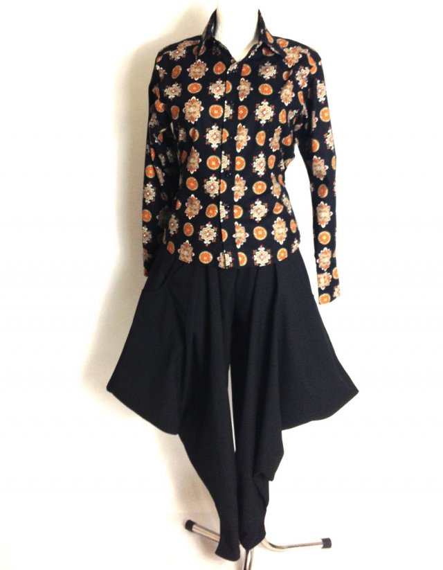 Bluzka w kolorze czarnym w kolorowe antyczne koła , zapinana na guziki.
