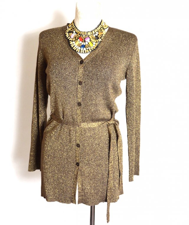 Dłuższy dzianinowy blezer w kolorze antycznego złota wykonany z dzianiny prążkowanej, zapinany na guziczki, w pasie wiązany (posiada pasek w komplecie ).blezer ma fason delikatnie rozkloszowany.
