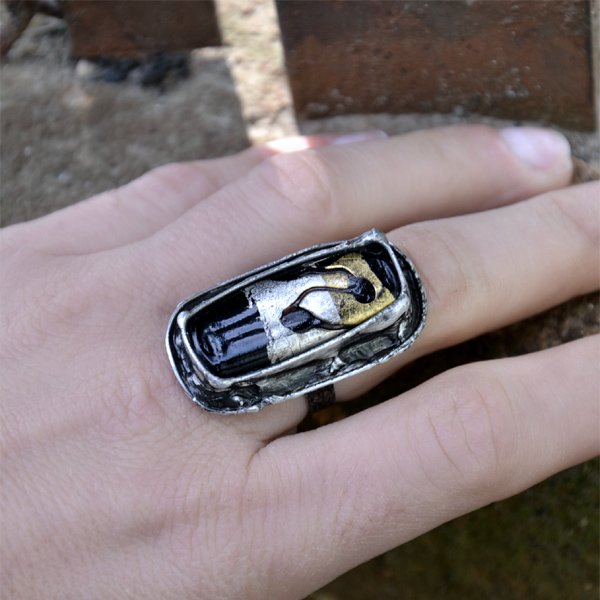 Niezwykły pierścionek z interesującym szkłem. Wymiary szkła wraz ze stylizowaną na stare srebro oprawą to ok. 4 x 2 cm. Obrączka regulowana. Biżuteria w 100% wykonana ręcznie, poszczególne sztuki mogą się minimalnie różnić.