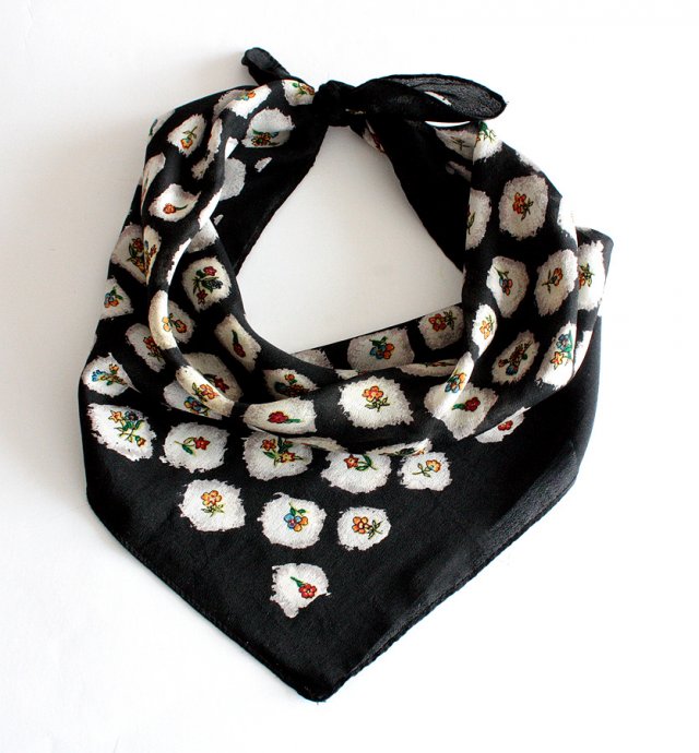 Apaszka w niewielkie wzory na czarnym tle. Wykonana prawdopodobnie z wiskozy.