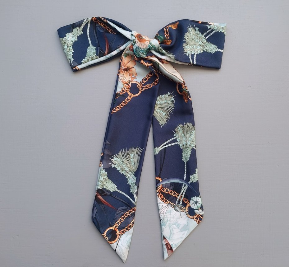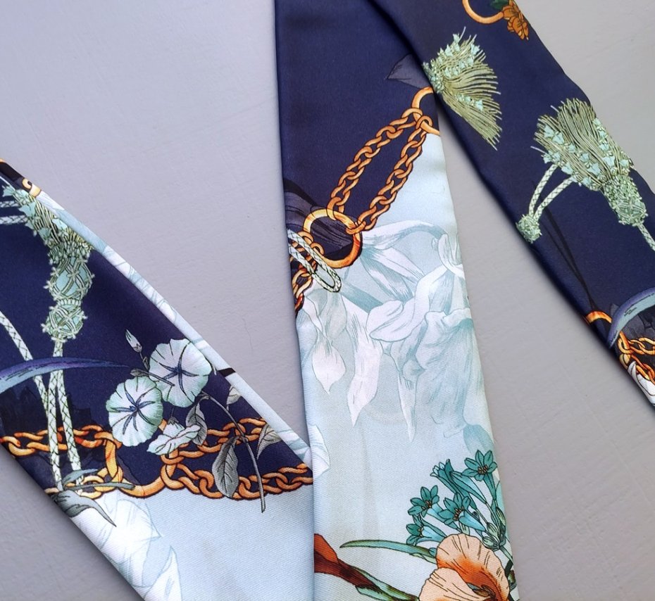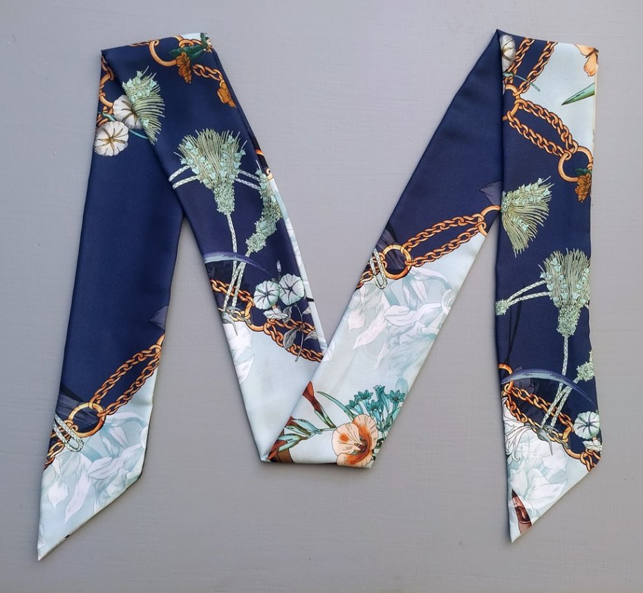 Apaszka typu twilly to akcesorium znane z wybiegów mody oraz praktyczny dodatek, który potrafi nadać szyku nawet najprostszej stylizacji. Ta ręcznie wykonana apaszka w odcieniach granatu posiada ciekawy deseń z motywem chwostów, łańcuchów i kwiatów, stanowiący klasyczny wymiar elegancji.