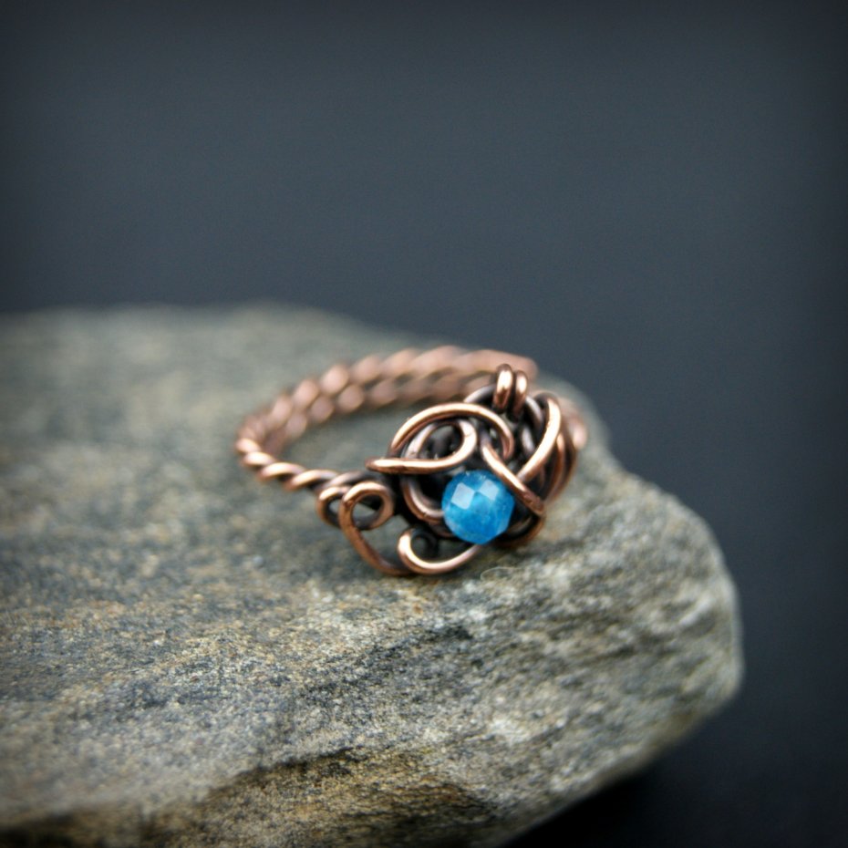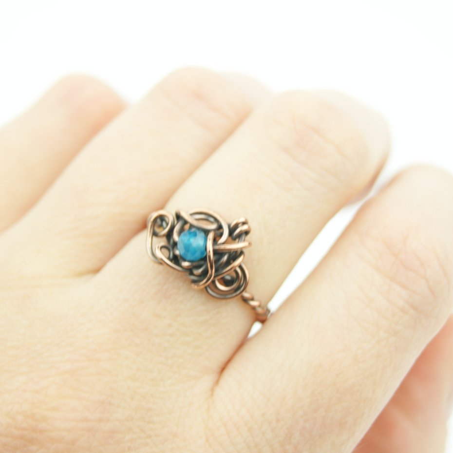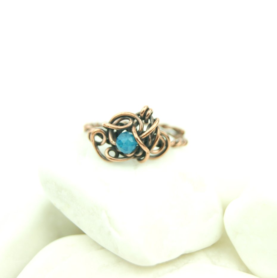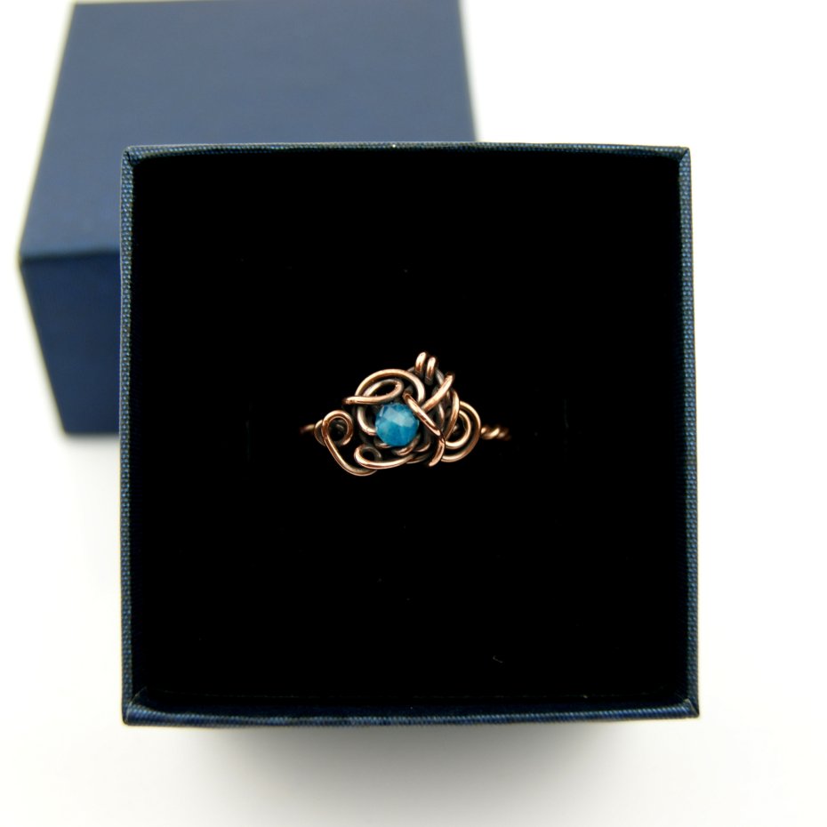 Pierścionek wykonany w pracochłonnej technice wire wrappingu. Centralnym punktem jest tu apatyt, który został misternie opleciony miedzią. Pierścionek w uniwersalnym rozmiarze, możliwość regulacji.