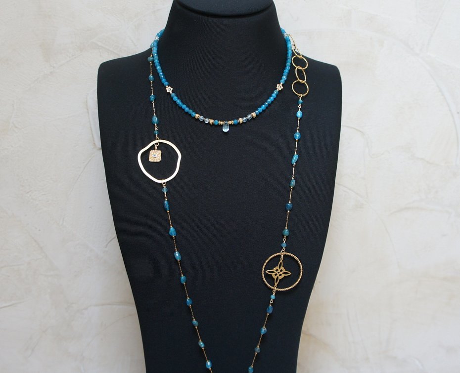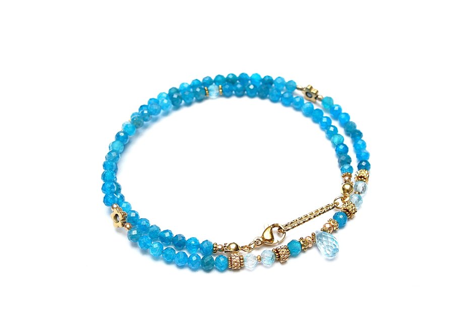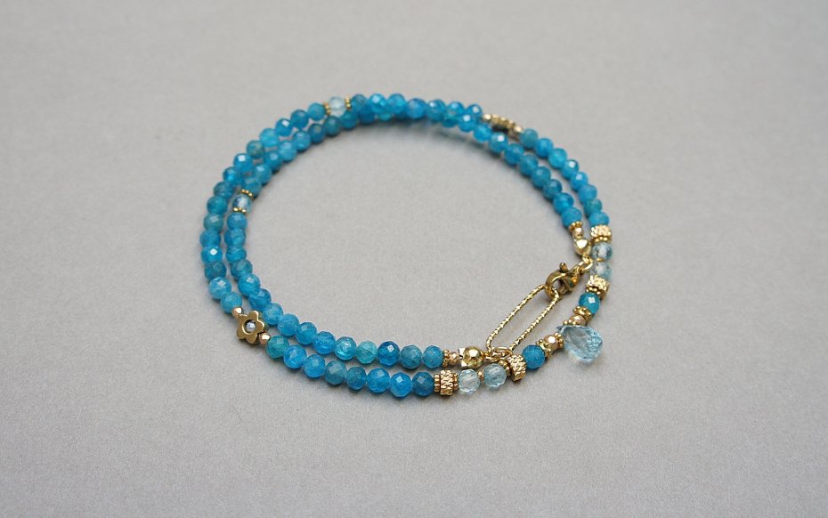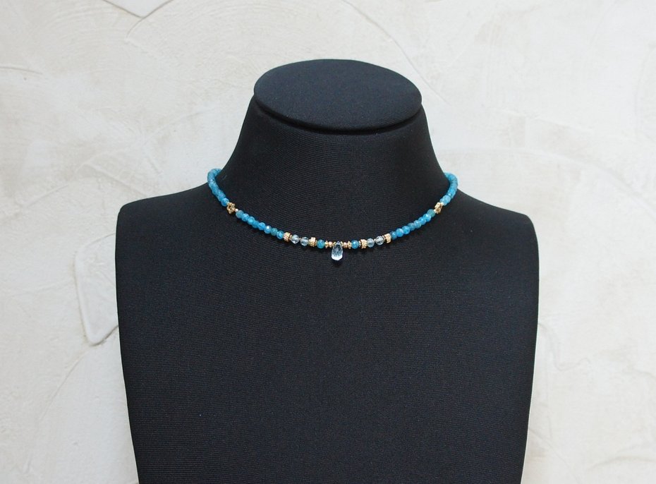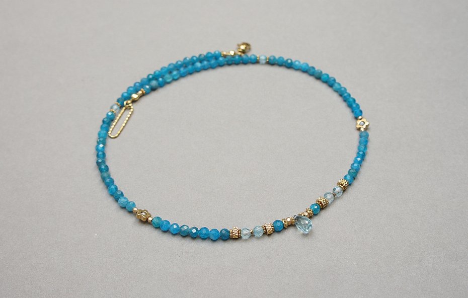 Krótki, delikatny naszyjnik wykonany w całości z pozłacanej stali szlachetnej oraz naturalnych, szlachetnych kamieni - fasetowanego apatytu [4mm], fasetowanego topazu [4mm], fasetowanych szafirów w błękitnym kolorze [2mm], fasetowanego, platerowanego hematytu [3 x 2mm oraz 2mm], przekładek z hematytu [1mm], kwiatków z hematytu [6mm] oraz zawieszki z naturalnego topazu w kształcie fasetowanej brioletki. Naszyjnik o długości ok. 43cm.