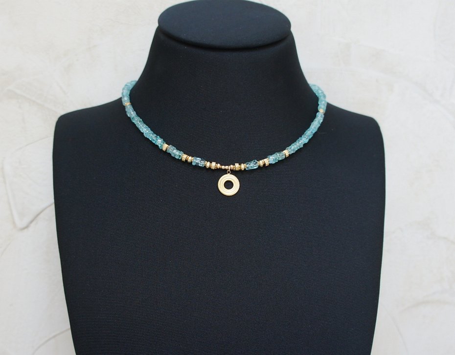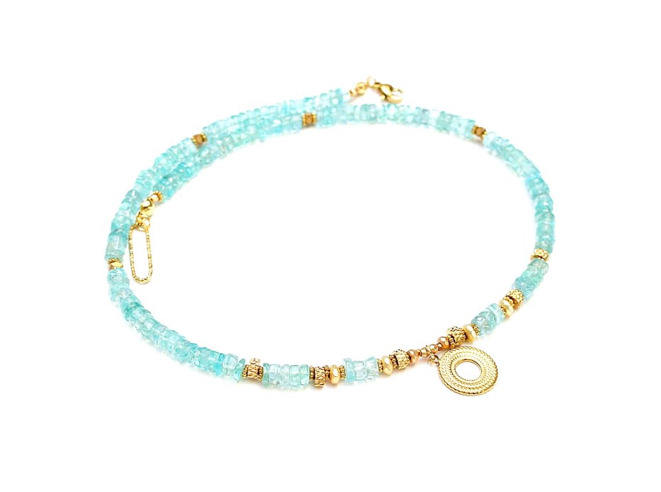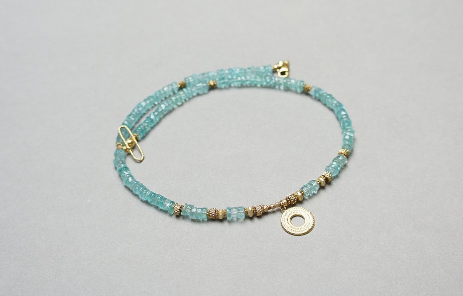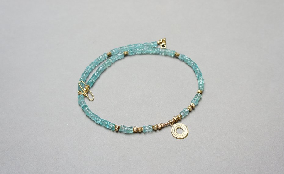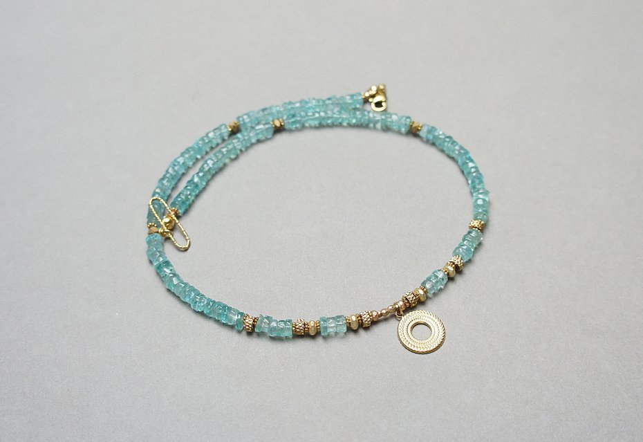 Krótki, delikatny naszyjnik wykonany w całości z pozłacanej stali szlachetnej oraz naturalnych, szlachetnych kamieni - talarki nieregularnego apatytu [4,5 x 2-3mm], przekładek z hematytu [4x2mm, 3 x 2mm oraz 2mm]. Naszyjnik o długości ok. 42cm.