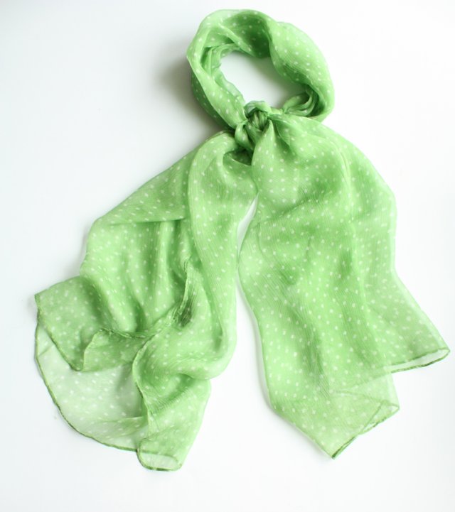 Zwiewny, cienki szal w kolorze soczystej zieleni. Wykonany z naturalnego, delikatnego jedwabiu.