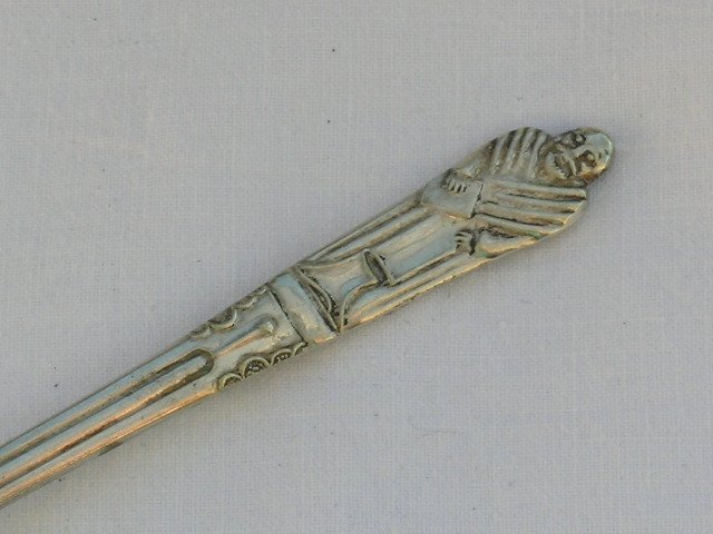 Bardzo ciekawa łyżeczka, na jaką od czasu do czasu trafiamy na łowach - okazuje się, że nazywa się apostolską ze względu na posągową a przyjazną postać w zdobieniu. Człowiek uczy się przez całe życie :) Sygnowana; EPNS, czyli platerowany nikiel. Wygodna, w ładnej proporcji. Najwyraźniej także kolekcjonerska, zwłaszcza, gdy zbierze się całe grono Dwunastu :) 2,3 x 11,4 cm. Stan zachowania bardzo dobry, gdzieniegdzie przebarwienia plateru do doczyszczenia.