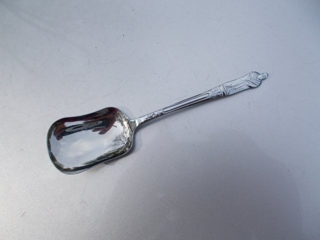 Ciekawa i nie spotykana ŁYŻECZKA DO CUKRU. Apostolski uchwyt i łopatka do nabierania cukru. CHROME PLATE.