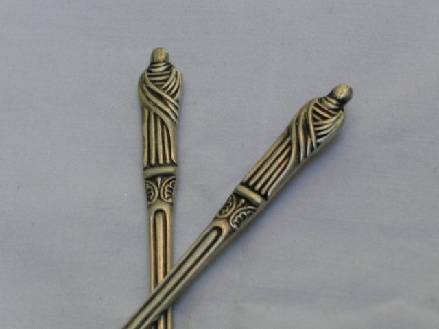 Bardzo ciekawe łyżeczki, na które od czasu do czasu trafiamy na łowach - okazuje się, że nazywają się łyżeczkami apostolskimi ze względu na posągowe a przyjazne postaci w zdobieniu. Człowiek uczy się przez całe życie :) Ten duet sygnowany EPNS, czyli szlachetnie elektro-platerowany-srebro-nikiel. Wygodne, w ładnej proporcji. Najwyraźniej także kolekcjonerskie, zwłaszcza, gdy zbierze się całe grono Dwunastu :) 2,3 x 11,4 cm. Stan zachowania bardzo dobry; do doczyszczenia.