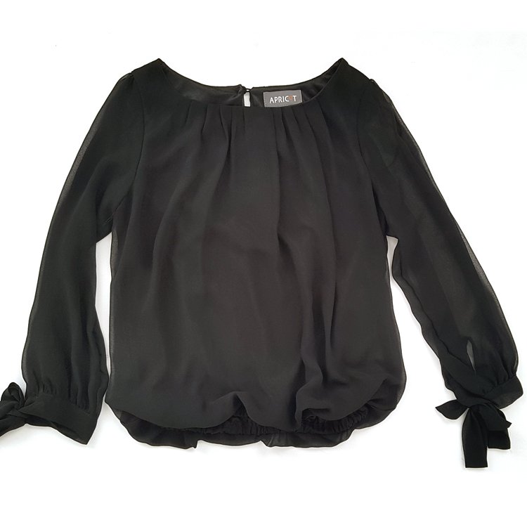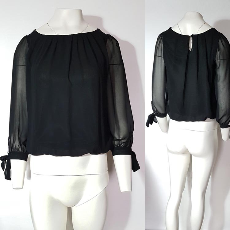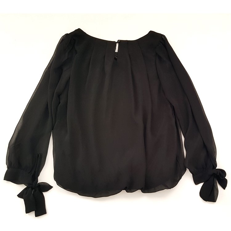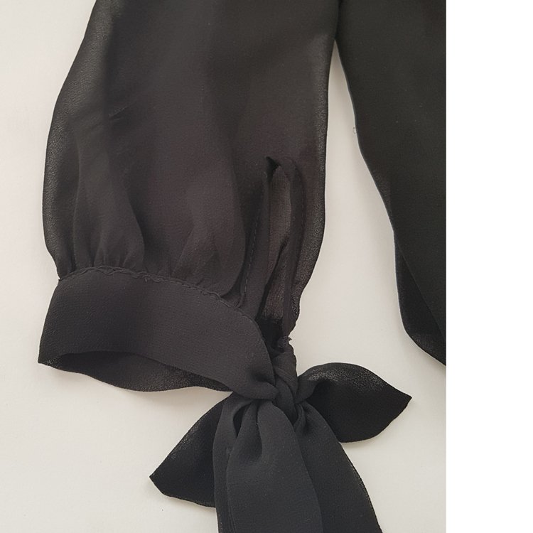 Bluzka damska z czarnego szyfonu, korpus na podszewce, dekolt okrągły wykończony zakładkami, dół na gumce. Rękawy długie bufiaste, zakończone mankietem wiązanym na kokardę, z tyłu zapięcie na guzik. Klasyczna propozycja do eleganckich zestawień.