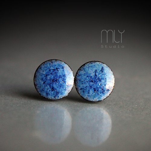Ceramiczne okrągłe kolczyki w formie sztyftów, ręcznie wykonane z delikatnej czekoladowobrązowej gliny kamionkowej, jednostronnie szkliwione mieszanką błękitnych szkliw z efektem plamek, na antyalergicznych sztyftach w kolorze srebrnym. Średnica ok. 11mm. Polecam
