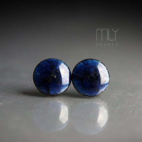 Ceramiczne okrągłe kolczyki w formie sztyftów, ręcznie wykonane z delikatnej czekoladowobrązowej gliny kamionkowej, jednostronnie szkliwione mieszanką błękitnych szkliw z efektem plamek, na antyalergicznych sztyftach w kolorze srebrnym. Średnica ok. 11mm. Polecam
