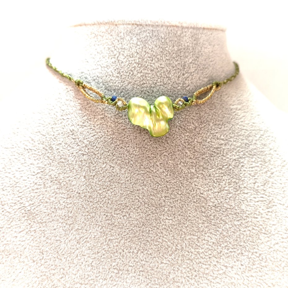 Użyte kamienie to: perła zielona słodkowodna ( kształty mogą różnić się nieznaczne rozmiar to około 10 x15 mm ), lapis lazuli ( 2,5 mm), fluoryt (3 mm), hematyt.