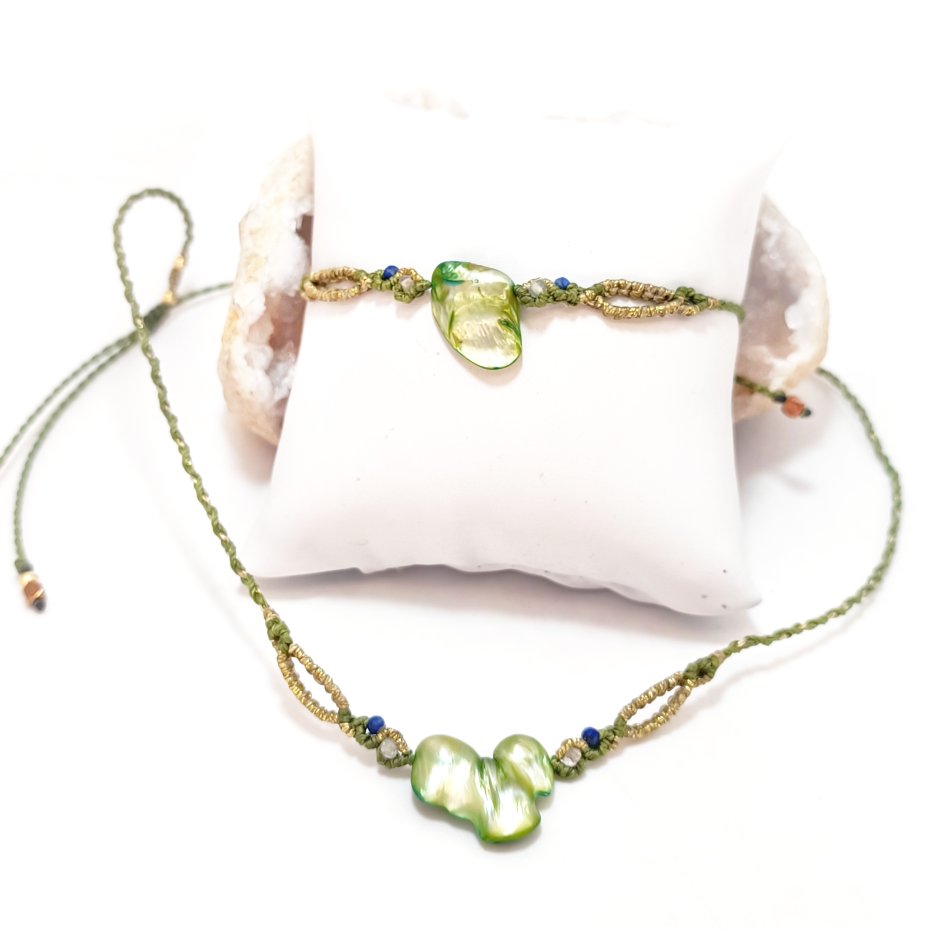Zestaw" Aquatic Plant " jest autorskim rękodziełem. Mikromakrama w połączeniu z naturalnymi kamieniami jest biżuterią elegancką, ciepłą w dotyku, lekką i przyjemną w noszeniu na co dzień i do wyszukanej kreacji.