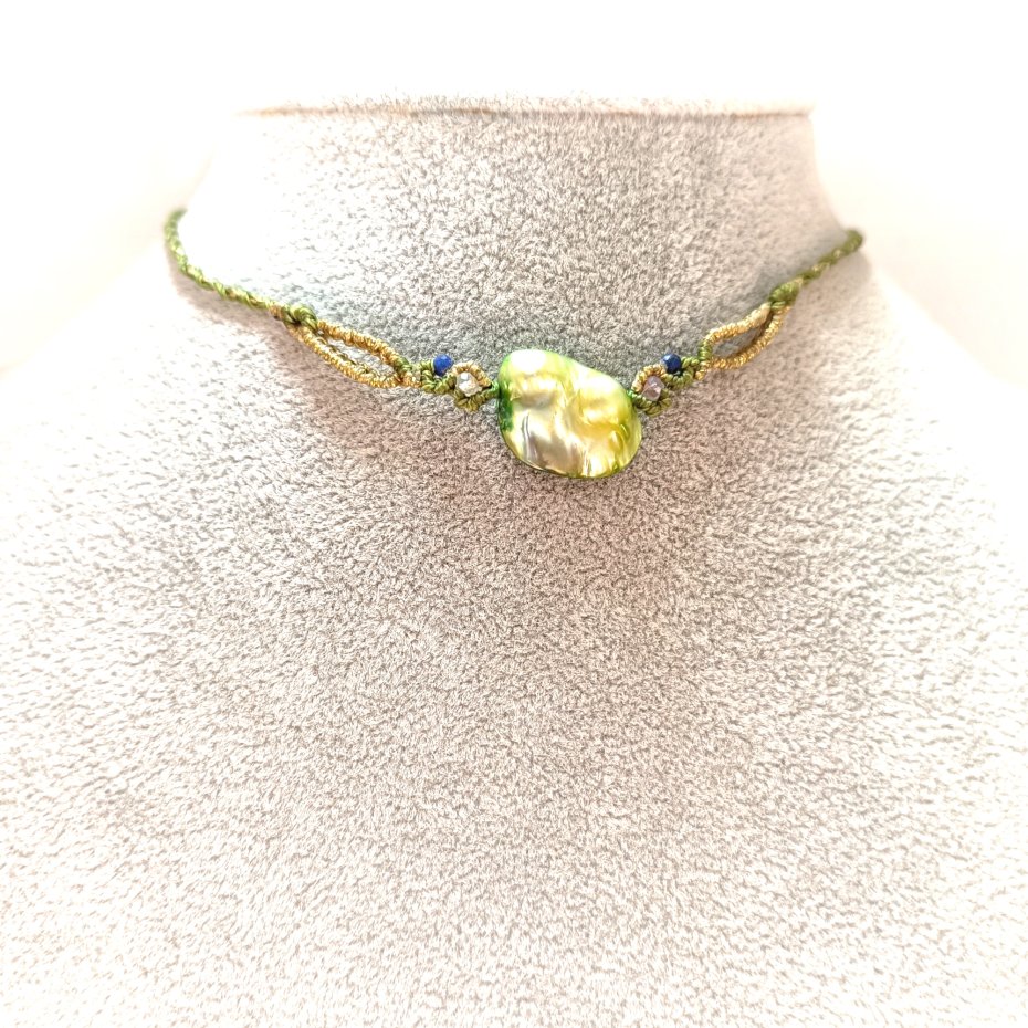 Naszyjnik jest autorskim rękodziełem. Mikromakrama w połączeniu z naturalnymi kamieniami jest biżuterią elegancką, ciepłą w dotyku, lekką i przyjemną w noszeniu na co dzień i do wyszukanej kreacji.