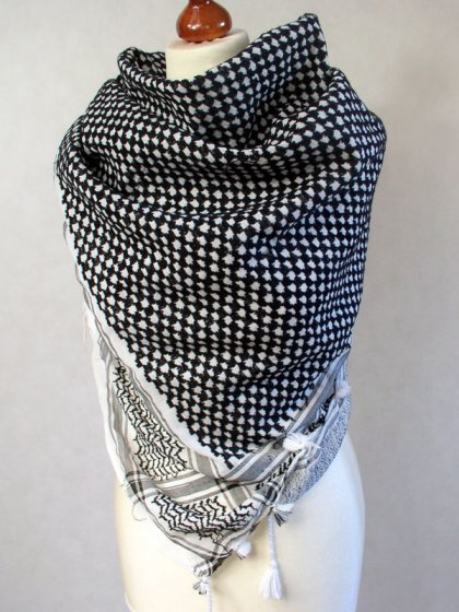 Arafatka biało-czarna.Dwa brzegi wykończone frędzlami związanymi w pompony.Materiał bawełna.