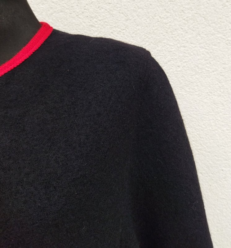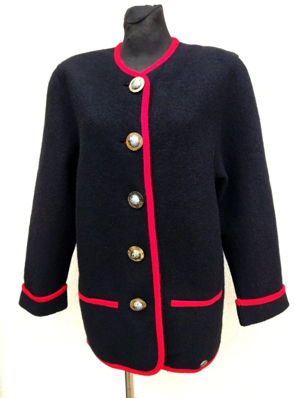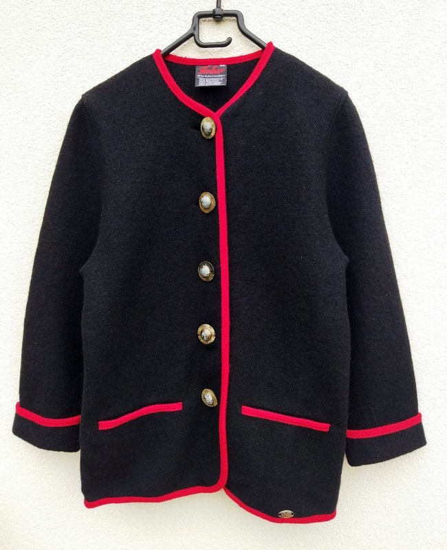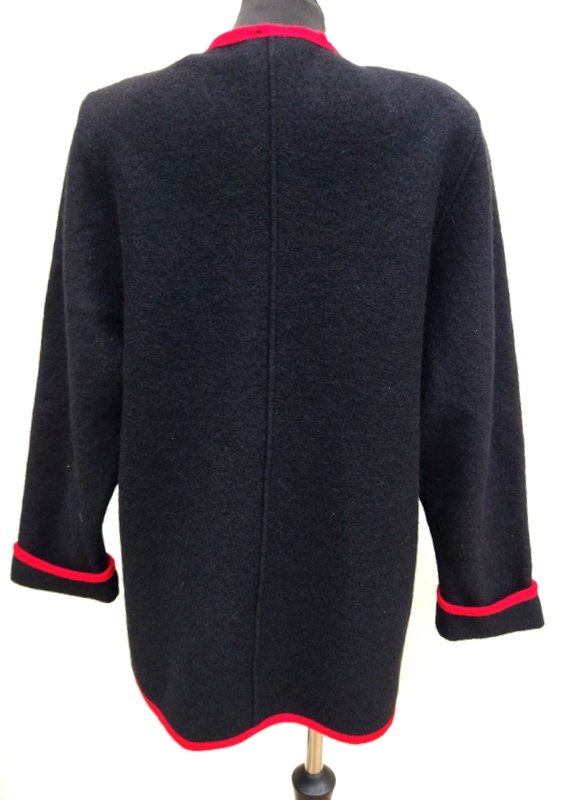 Kurtka z wełnianej tkaniny w czarnym kolorze z czerwonymi dzianinowymi lamówkami. bez kołnierza, z dwiema naszywanymi kieszeniami. zapinana na ozdobne postarzane guziki. Bez podszewki