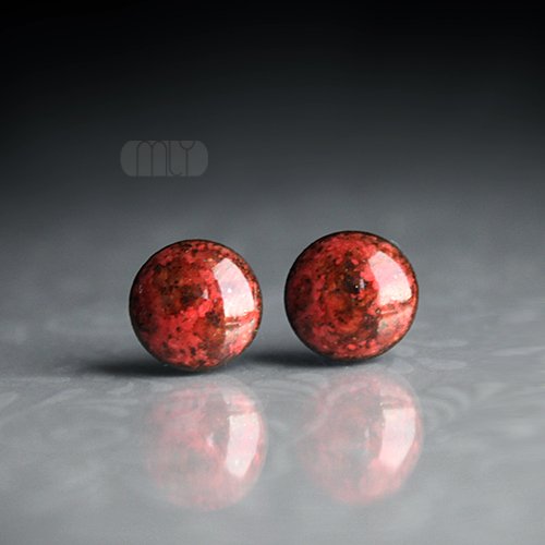 czerwonym szkliwem z efektem plamek i pięknym połyskiem, na sztyftach w kolorze srebrnym. Średnica ok. 9mm.Polecam