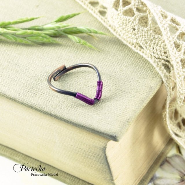 Uroczy pierścionek z miedzi i kolorowego drutu jubilerskiego ( drut barwiony metodą elektroforezy) . Pierścionek ma rozmiar uniwersalny. Można go dopasować do każdego rozmiaru. Pierścionek został spatynowany na antyczny kolor i wypolerowany.