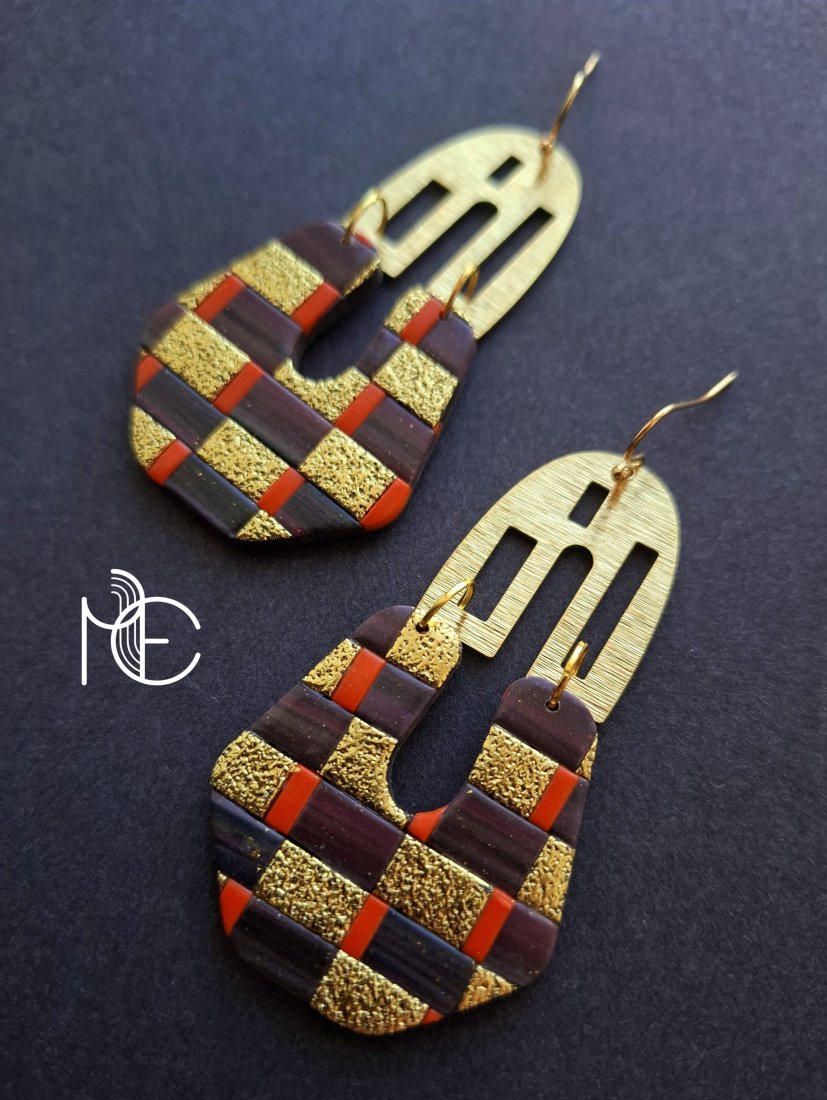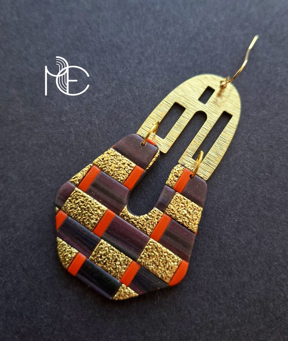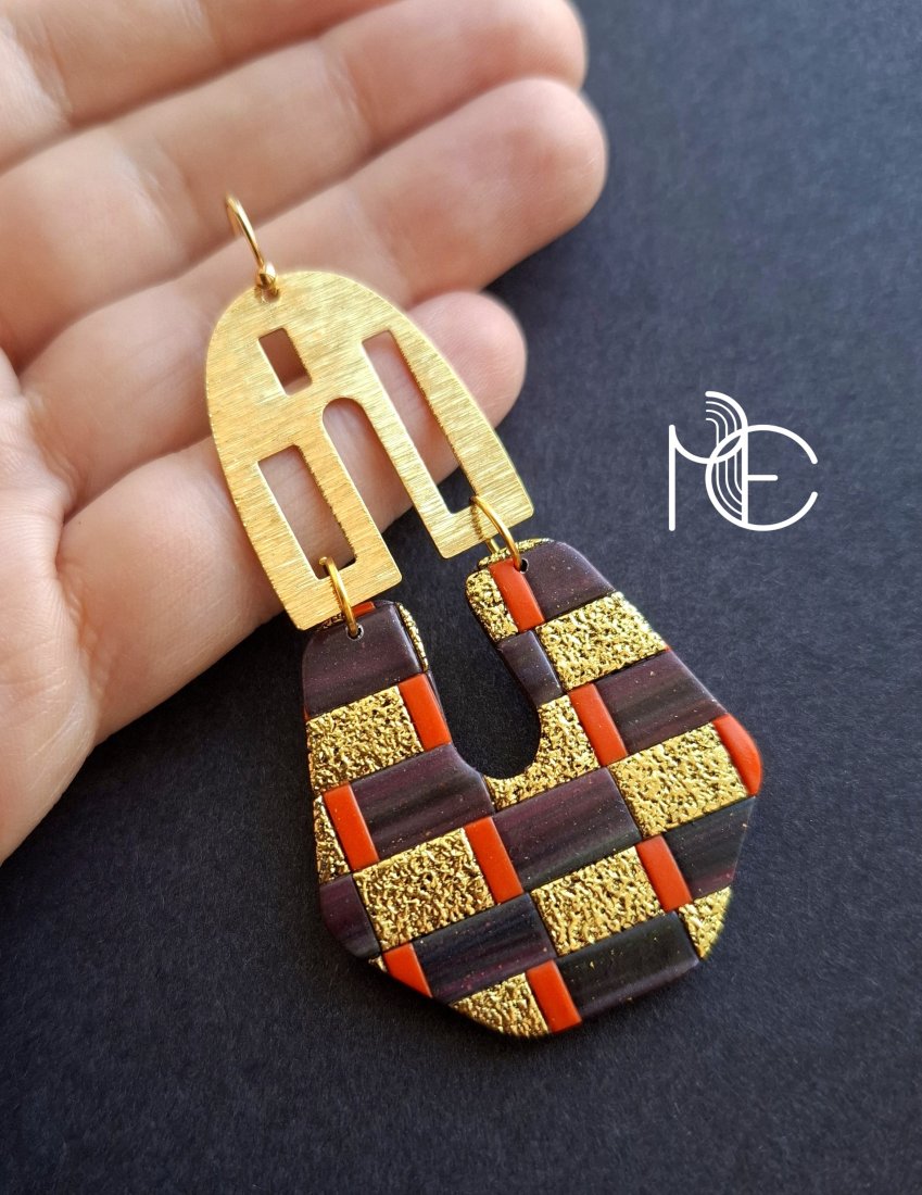 Kolczyki wiszące wykonane z wysokiej jakości glinki polimerowej z dodatkiem ozdobnych elementów metalowych. Jednostronne z prostymi, pozłacanymi i nieuczulającymi biglami. Wymiary: długość wraz z zapięciem: 7,8 cm; szerokość max. 3,8 cm. Wykonane w jedynym egzemplarzu.