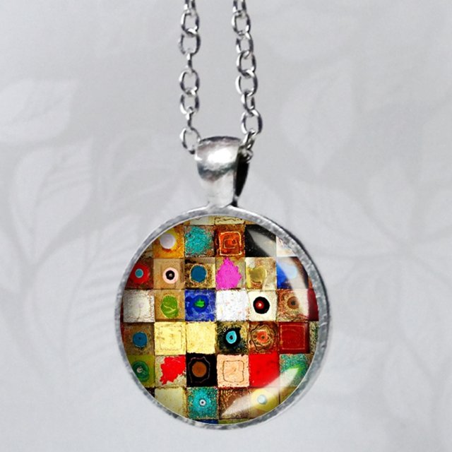 Unikatowy naszyjnik: okrągły wisiorek w kolorze srebra, zawieszony na łańcuszku w tym samym kolorze. Autorski motyw graficzny umieszczony za wypukłym szkłem i oprawiony w hipoalergiczną bazę w kolorze srebra. Biżuteria nie zawiera niklu i ołowiu.