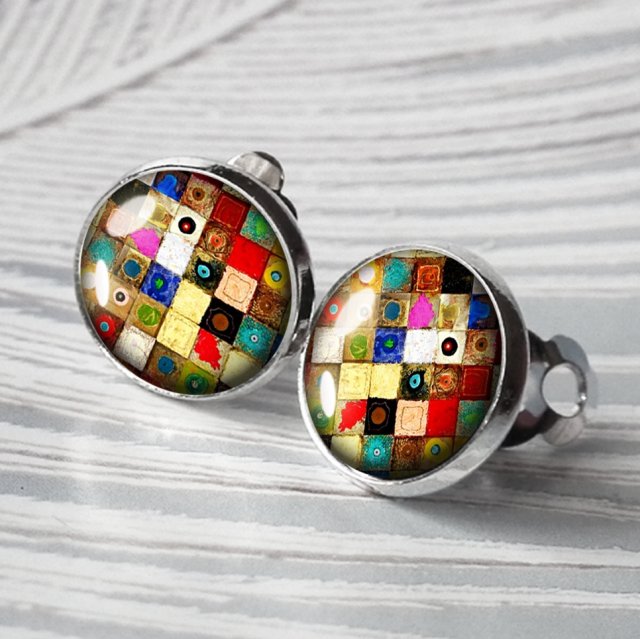 Oryginalne klipsy z grafiką, zatopioną pod wypukłym szkiełkiem ( tzw. szklanym kaboszonem dającym delikatny efekt trójwymiarowości) i oprawioną w hipoalergiczną bazę w kolorze srebra, bez niklu i ołowiu. Grafika jest najwyższej jakości, bardzo wyraźna i nasycona. Baza i zapięcie antyalergiczne, posrebrzane. Urocze, nieduże, delikatne klipsy. Wielkość -średnica- 1,5 cm.