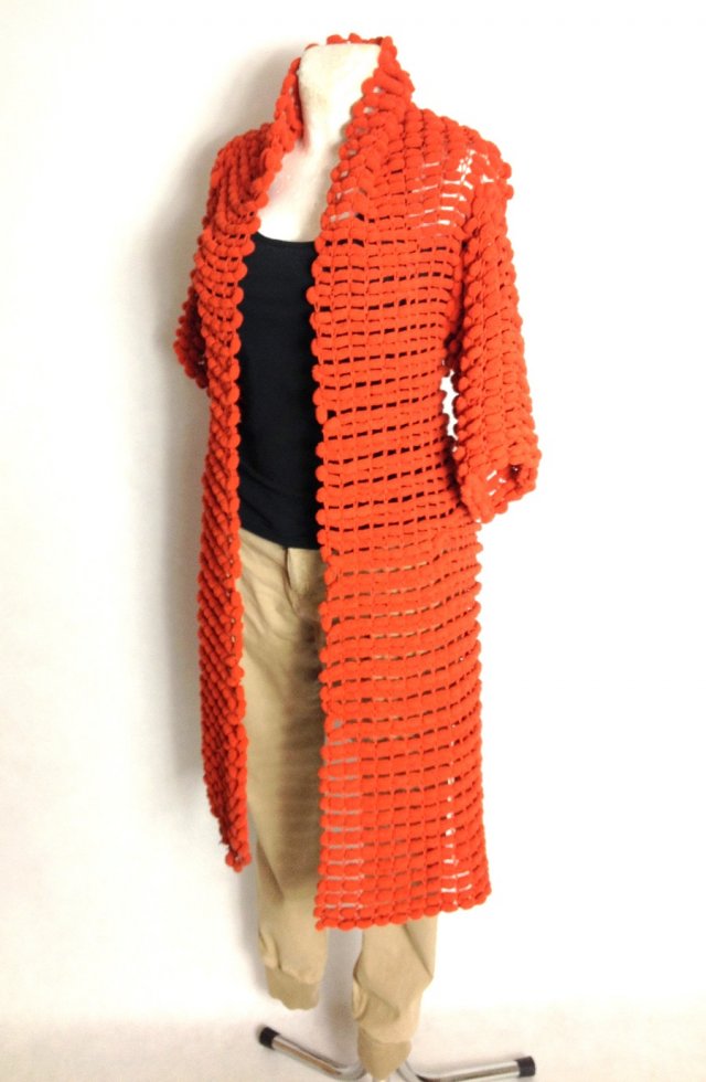 Artystyczna długa narzutka z rękawem za łokieć w kolorze pomarańczowym, wykonana z niesamowicie miękkiego, bardzo przyjemnego materiału z wypukłych kuleczek, ma fason otwarty, boki są dłuższe , tył krótszy. Unikatowa- nikt takiej nie ma.