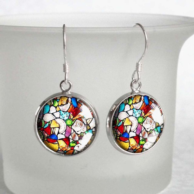 Delikatne, śliczne kolczyki wiszące z oryginalną grafiką,zatopioną pod wypukłym szkiełkiem i oprawioną w hipoalergiczną bazę w kolorze srebra. Grafika jest najwyższej jakości, wyraźna i nasycona. Bigle otwarte ze srebra próby 0,925. Oryginalne kaboszony wykonane ręcznie według mojego projektu i przeze mnie, z dbałością o każdy detal.