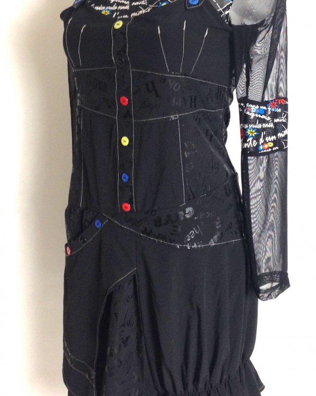 Unikatowa sukienka wykonana dwóch rodzajów tkaniny, część wierzchnia sukienki wykonana z trzymającego elastycznego materiału w tłoczone napisy, przy dekolcie kolorowe guziki, które pełnią funkcję dekoracyjną, luźny płat materiału zwisa z lewego boku sukienki i również jest zdobiony guzikami, u dołu z jednej strony sukienka ściągnięta gumką, u góry i przy rękawach sukienka wykonana z siateczkowej elastycznej tkaniny w kolorowe napisy.Obie części sukienki są ze sobą zszyte, u góry zapinane ramiączka. Z boku zasuwana na suwak