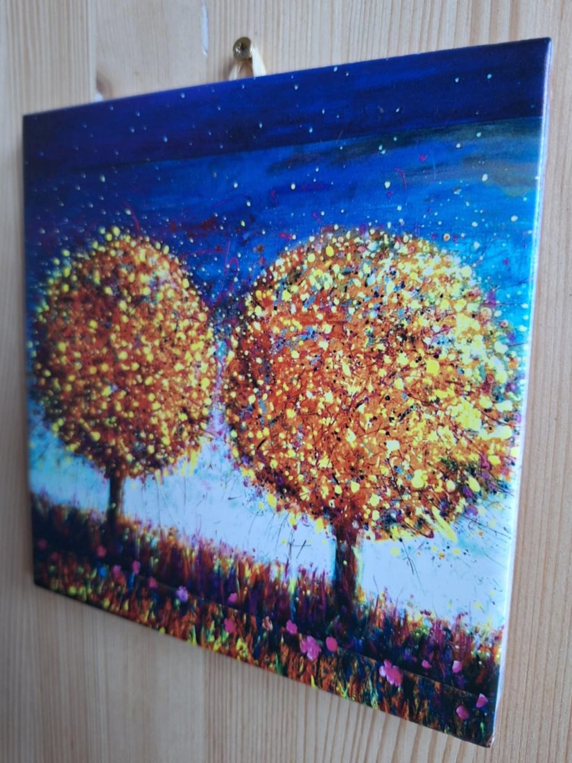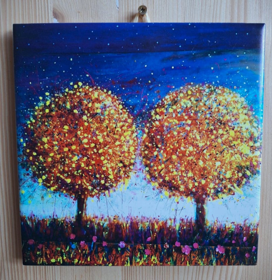 Płytka ceramiczna z kolorowym obrazem mojego autorstwa o wymiarach 15 x 15 cm . To jesienny pejzaż z dwoma kolorowymi, bajkowymi drzewami, pełen pozytywnej energii, światła, wiatru, spadających liści i zapachów. Doskonały pomysł na prezent dla znajomych, rodziny, kolegów z firmy. Płytki mają zawieszkę i naturalny korek na odwrocie , są gotowe do zawieszenia. Płytkę można również wykorzystać jako dekor i przykleić do ściany, połączyć z innymi płytkami, kafelkami. Możliwe jest też oprawienie płytki w stylowe ramki i ustawienie na biurku lub półce.Kilka dekoracyjnych płytek mojego autorstwa wprowadzi światło i kolor i energię do Twojego domu a znajomym sprawi wielką radość